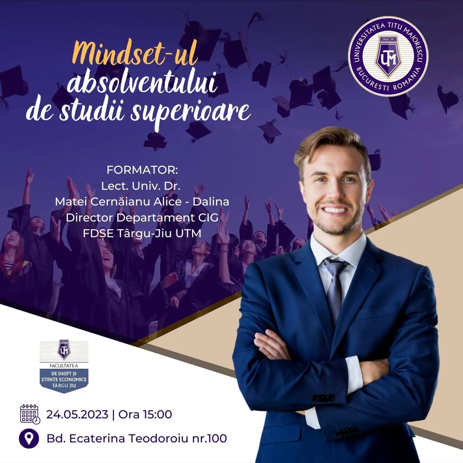 Pe data de 24.05.2023 la ora 15:00, Facultatea de Drept și Științe Economice din cadrul Universității Titu Maiorescu – Târgu Jiu, vă invită la atelierul „Mindset-ul absolventului de studii superioare”.