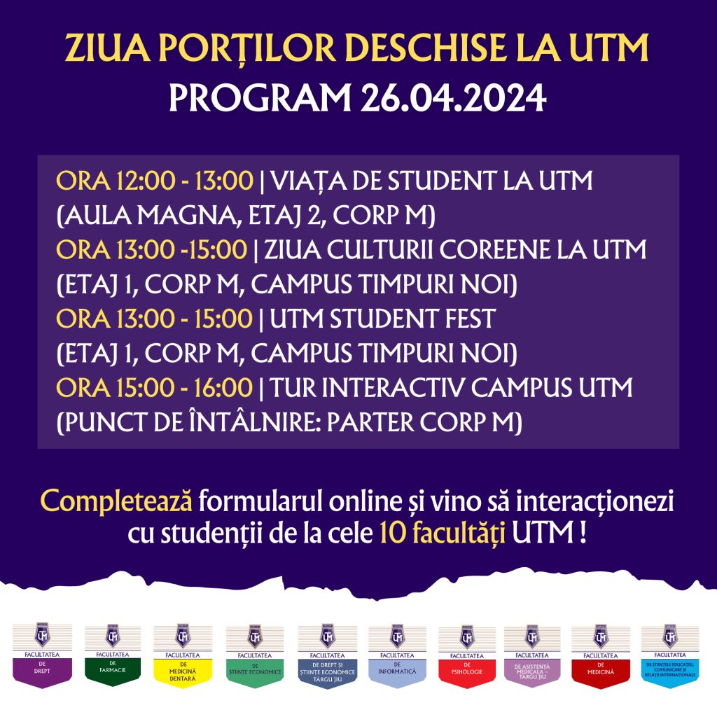 Ziua Porților Deschise este o oportunitate unică pentru elevi să descopere oferta noastră educațională de la cele 10 facultăți UTM. Participarea la Ziua Porților Deschise vă va oferi șansa de a interacționa cu studenții noștri, de a explora facilitățile noastre moderne și de a afla mai multe despre programele noastre academice remarcabile.