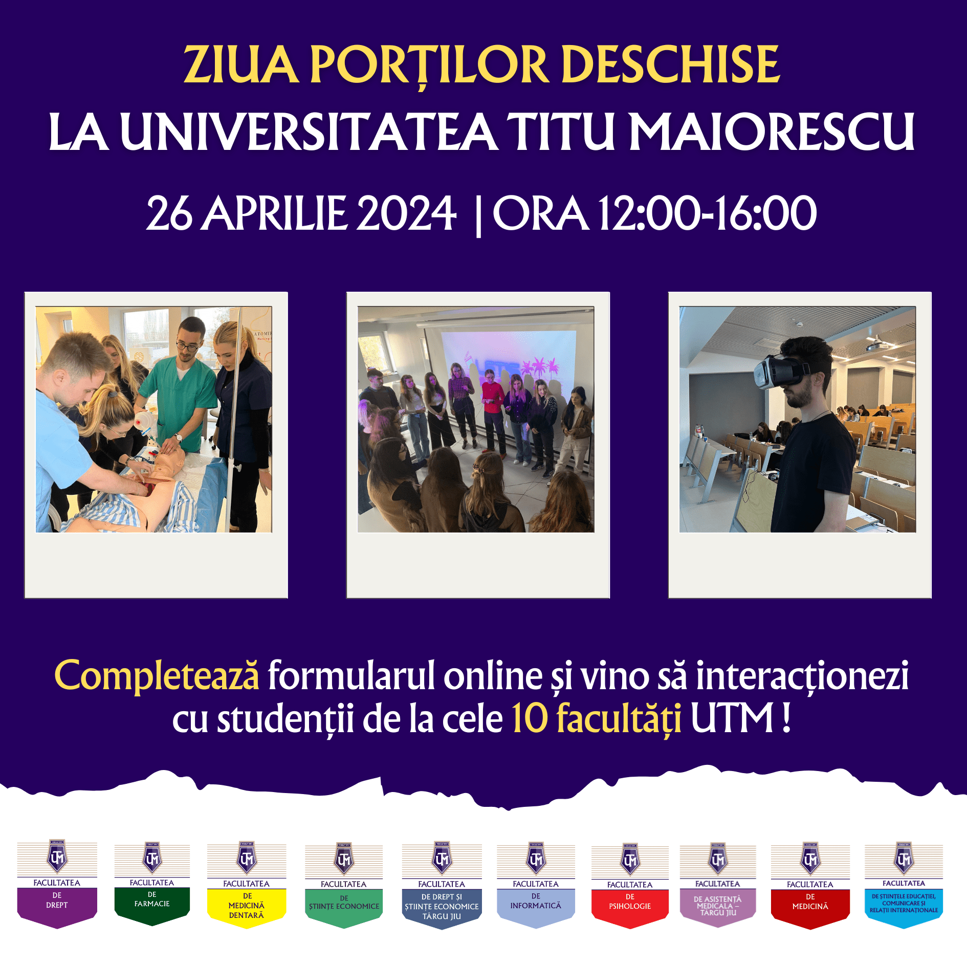 Ziua Porților Deschise este o oportunitate unică pentru elevi să descopere oferta noastră educațională de la cele 10 facultăți UTM. Participarea la Ziua Porților Deschise vă va oferi șansa de a interacționa cu studenții noștri, de a explora facilitățile noastre moderne și de a afla mai multe despre programele noastre academice remarcabile.